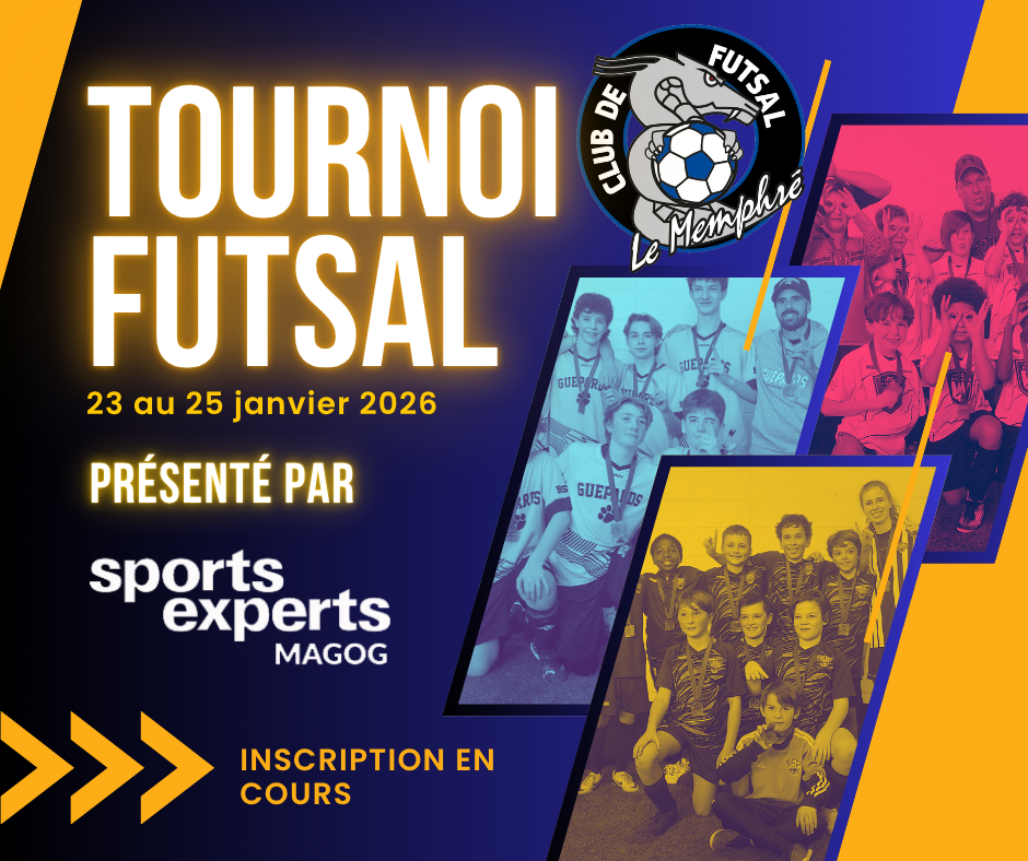 Cette année encore, le Club de Soccer Magog est fier de présenter en partenariat avec Sports Experts de Magog le tournoi Futsal Sport Expert 2025, du 23 au 25 janvier 2026 !